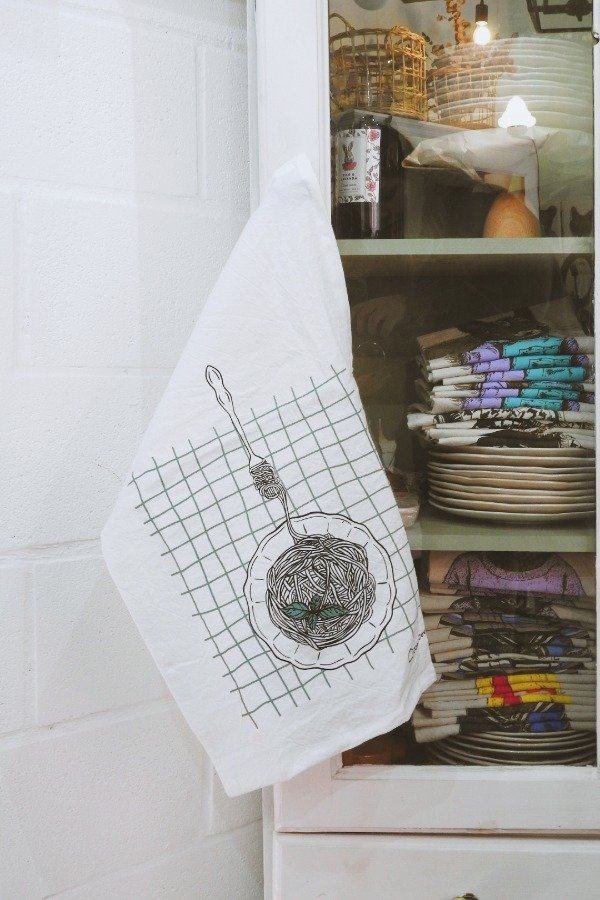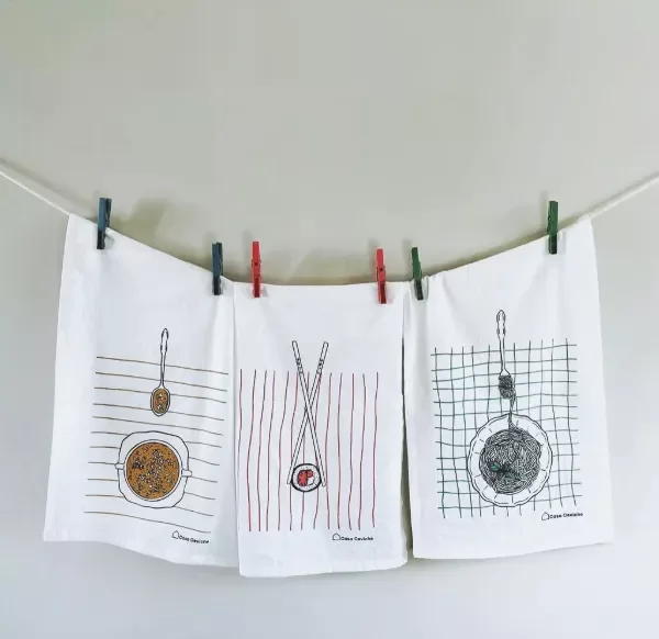 La colección Food captura los platos más característicos de la vida cotidiana actual. Son 100% algodón, tela tussor Off White y vienen con tira para colgar.