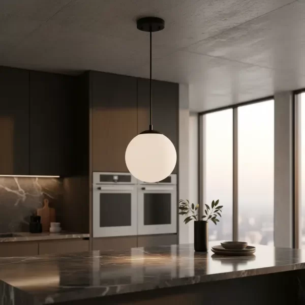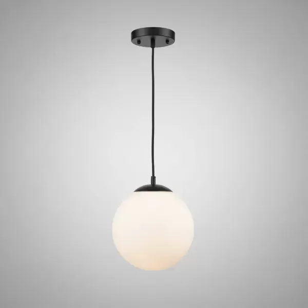 Material: hierro, cable (negro, blanco o transparente), globo de vidrio opal satinado.